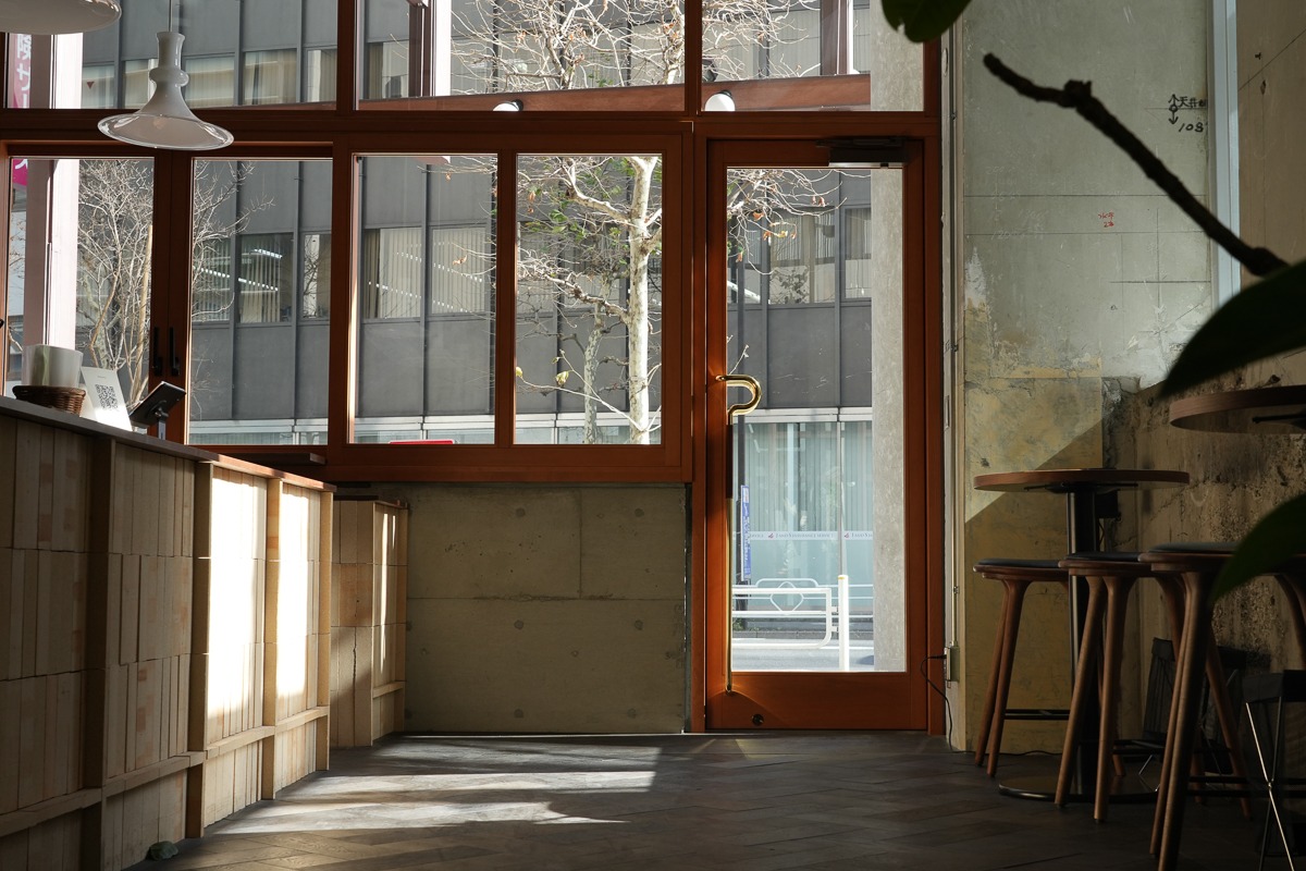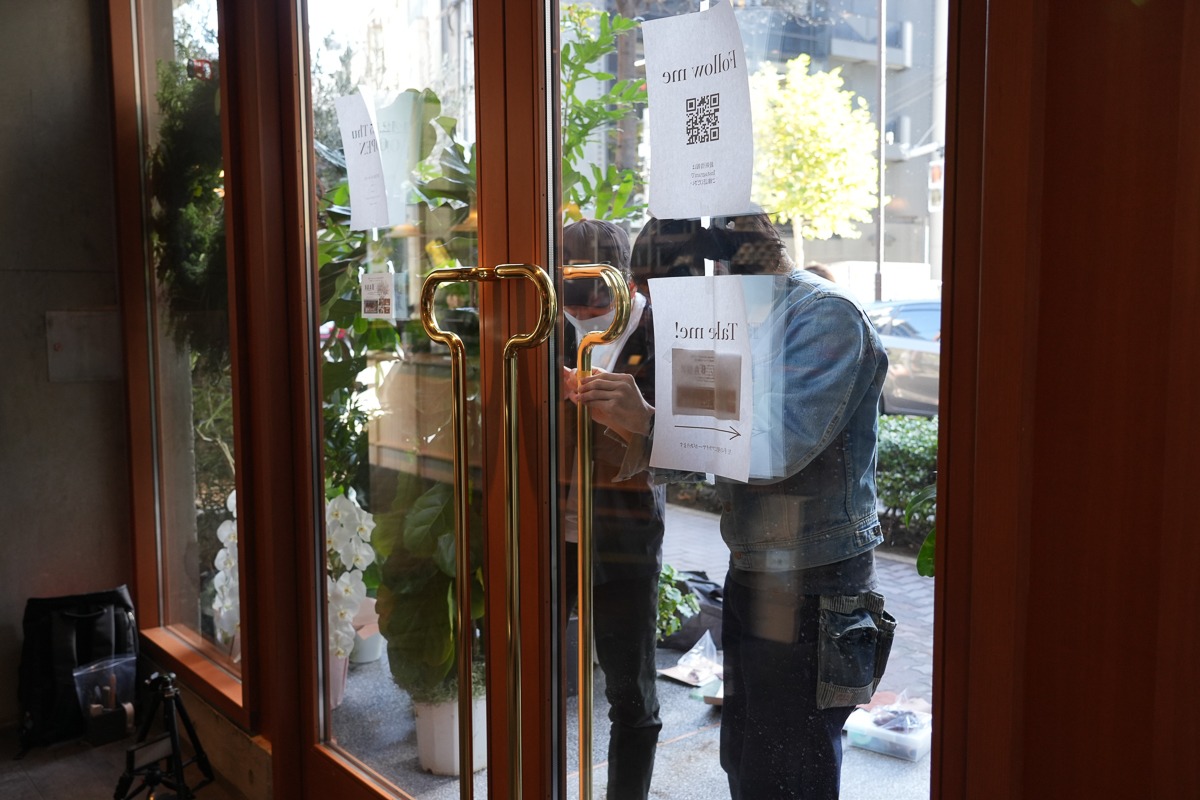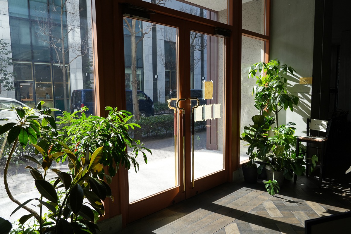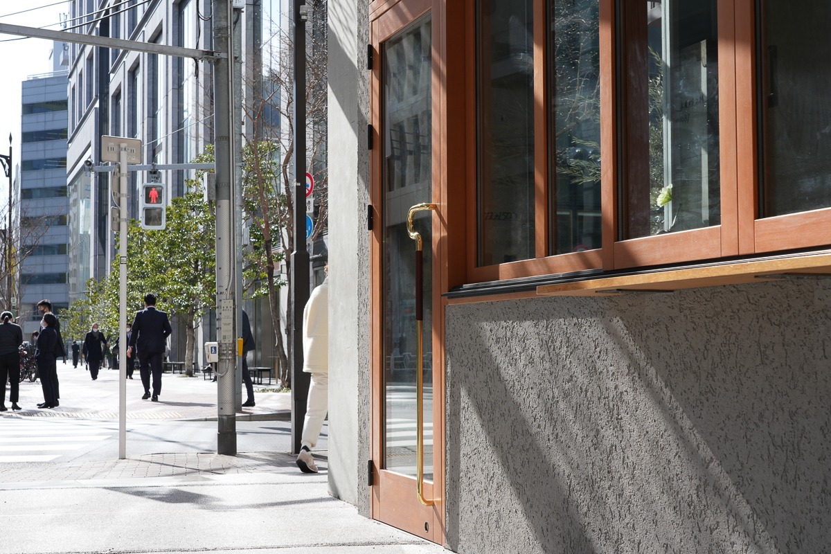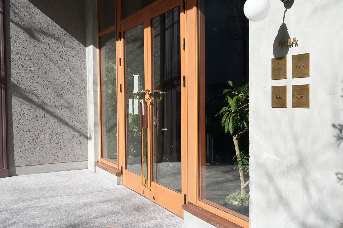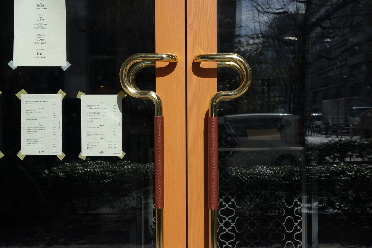 インテリア、エクステリア革施工のご紹介です。日本橋兜町にオープンした食の複合ショップ「BANK」のエントランス扉ハンドル革巻き施工をさせていただきました。