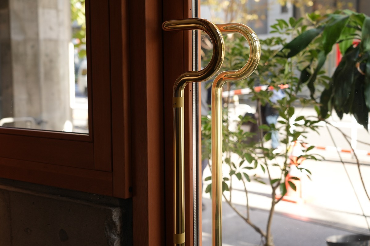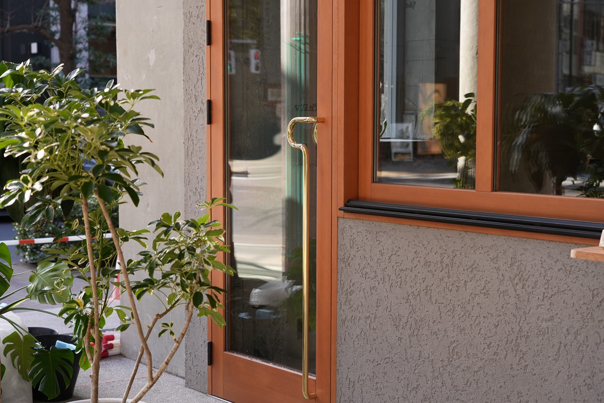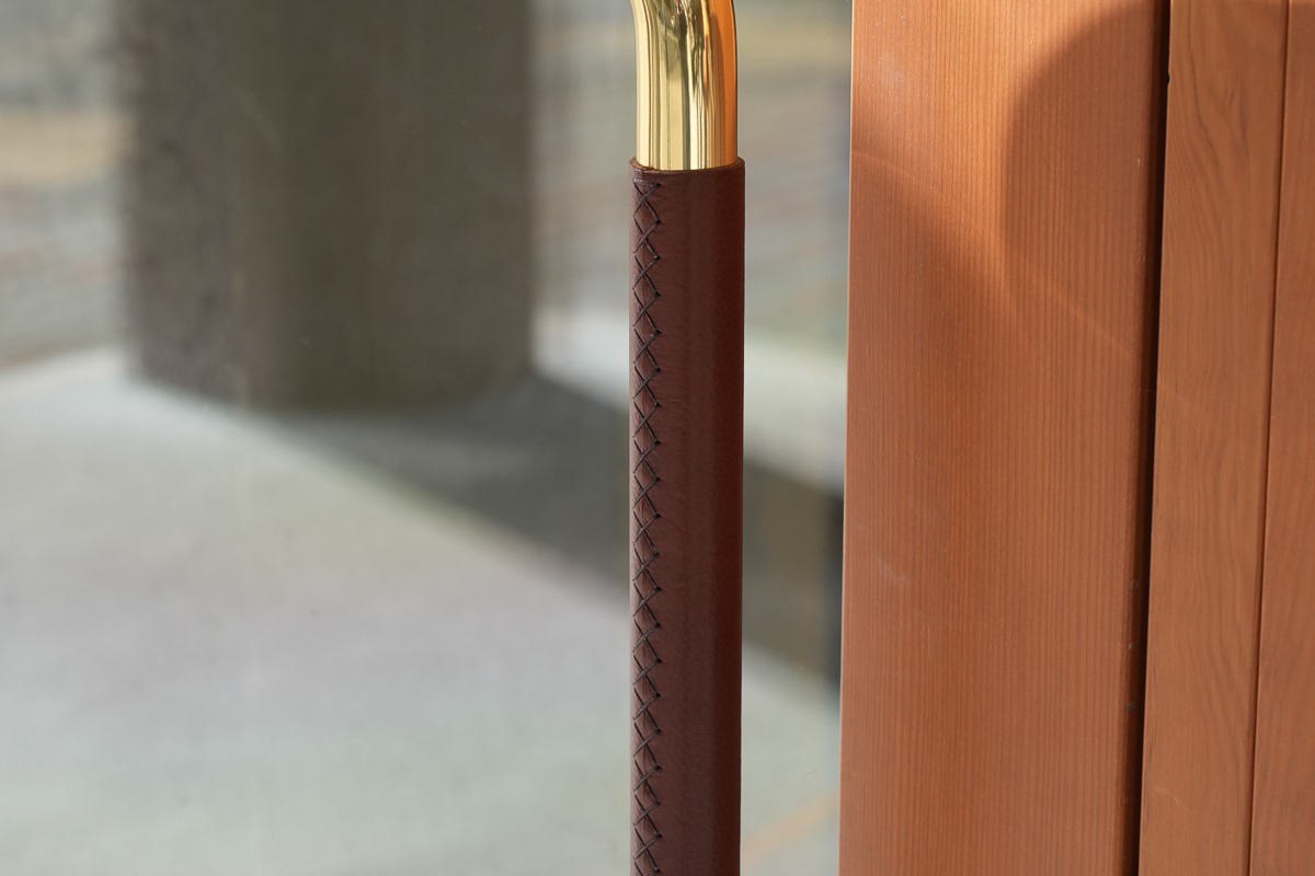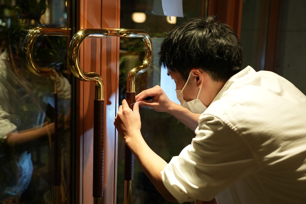 さらに、革は長く使うほどに味わい深い経年変化(エイジング)を楽しむことができ、素材の個性や店舗の雰囲気を引き立てる要素となります。職人が手作業で巻くことで、一点ものの特別な仕立てと、温もりが空間にプラスされます。それにより、機能面だけでなく、ハンドル自体が空間演出の一部として強く印象づけられます。