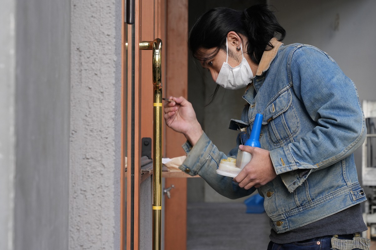 事前にハンドルの直径に合わせて革を裁断し、手縫い用の穴あけ加工を施した革を用意します。現場では、その革をひと針ひと針丁寧に縫い上げていきます。縫い進める際は、革の伸びや繊維の方向に注意し、均一な張りを保ちながら巻き付けることで、シワやたるみを最小限に抑えます。最後に縫い目や革の収まりを微調整して美しく仕上げます。確かな職人技術とこだわりの素材で、エントランスハンドルが唯一無二の特別なものに生まれ変わります。