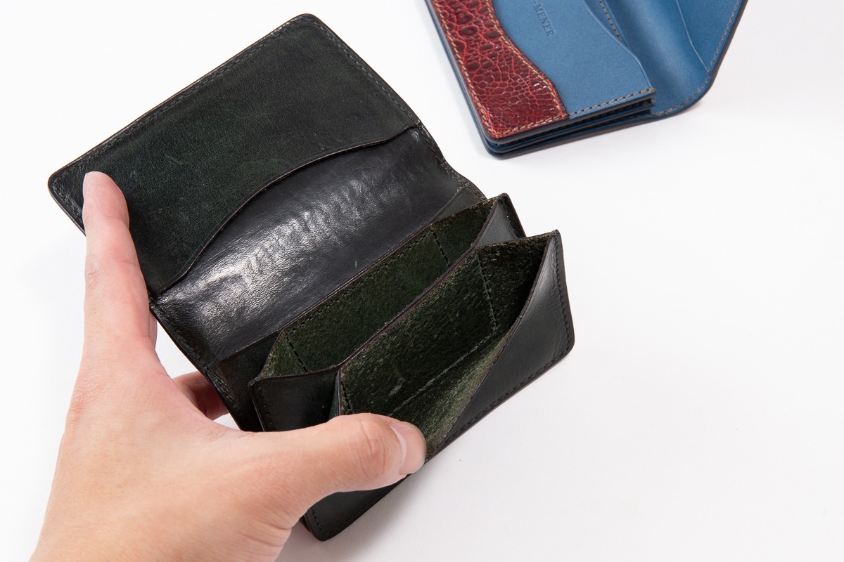 今回はその悩みを解消すべく、内側に贅沢に牛革を貼り合わせる「裏貼り(無双仕立て)」へとアップデート。銀面(革の表面)同士を合わせることで、いつまでも滑らかな指触りを維持し、名刺を差し出すその一瞬の所作を美しく支えます。
