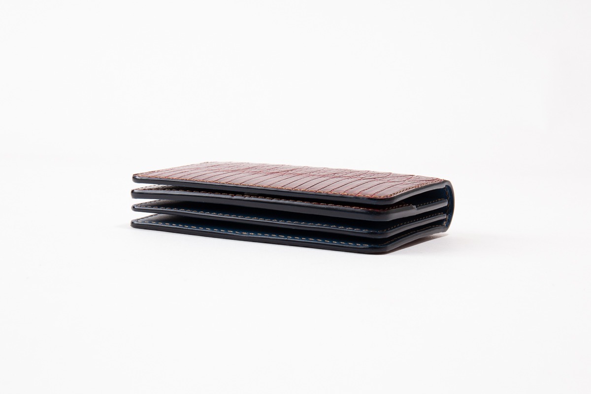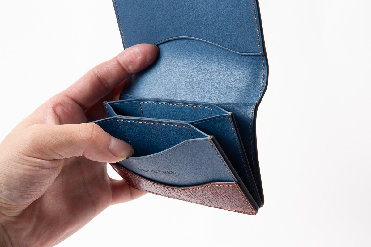 仕立ては、革の断面をあえて見せる「切れ目」を採用。断面(コバ)には丹念に顔料仕上げを施しています。 ジャクルシーと牛革、性質の異なる二つの層を寸分狂わぬ精度で貼り合わせ、磨き上げたその断面は、まるで硬質な樹脂のような光沢を放ちます。顔料で整えることで、赤茶とブルーの境界線がくっきりと際立ち、製品全体にキリッとした輪郭と、フルオーダーならではの重厚感を与えています。